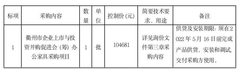 參照《中華人民共和國(guó)政府采購(gòu)法》、《政府采購(gòu)貨物和服務(wù)招標(biāo)投標(biāo)管理辦法》等規(guī)定,衢州市智信工程咨詢有限公司受衢州市智慧置業(yè)有限公司的委托,就衢州市企業(yè)上市與投資并購(gòu)促進(jìn)會(huì)(籌)辦公家具采購(gòu)項(xiàng)目進(jìn)行詢價(jià),本項(xiàng)目為非依法必招項(xiàng)目,現(xiàn)請(qǐng)合格供應(yīng)商參加投標(biāo)。