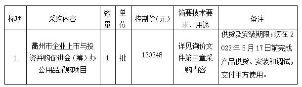 參照《衢州市國資委關于印發(fā)<衢州市國有企業(yè)采購管理辦法(試行)>的通知》(衢國資發(fā)[2020]36號)、《中華人民共和國政府采購法》、《政府采購貨物和服務招標投標管理辦法》等規(guī)定,衢州市智信工程咨詢有限公司受衢州市智慧置業(yè)有限公司的委托,就衢州市企業(yè)上市與投資并購促進會(籌)辦公用品采購項目進行詢價,本項目為非依法必招項目,現(xiàn)請合格供應商參加投標。