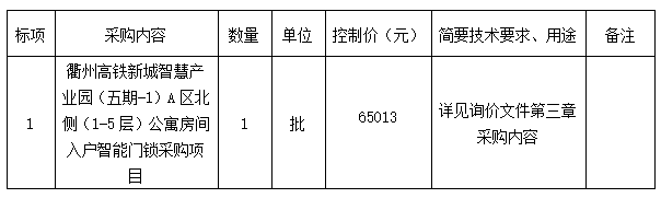 參照《衢州市國資委關(guān)于印發(fā)<衢州市國有企業(yè)采購管理辦法(試行)>的通知》(衢國資發(fā)[2020]36號)、《中華人民共和國政府采購法》、《政府采購貨物和服務(wù)招標(biāo)投標(biāo)管理辦法》等規(guī)定,衢州市智信工程咨詢有限公司受衢州市智慧置業(yè)有限公司、的委托,就衢州高鐵新城智慧產(chǎn)業(yè)園(五期-1)A區(qū)北側(cè)(1-5層)公寓房間入戶智能門鎖采購項(xiàng)目進(jìn)行詢價,本項(xiàng)目為非依法必招項(xiàng)目,現(xiàn)請合格供應(yīng)商參加投標(biāo)。