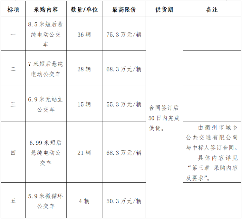 根據《衢州市國有企業(yè)采購管理辦法(試行)》(衢國資發(fā)〔2020〕36號)等有關規(guī)定,衢州市兩山工程咨詢管理有限公司受浙江衢州公交集團有限公司委托,就2024年度(第二批次)浙江衢州公交集團有限公司公交車采購項目進行公開招標,歡迎國內合格的投標人前來投標。