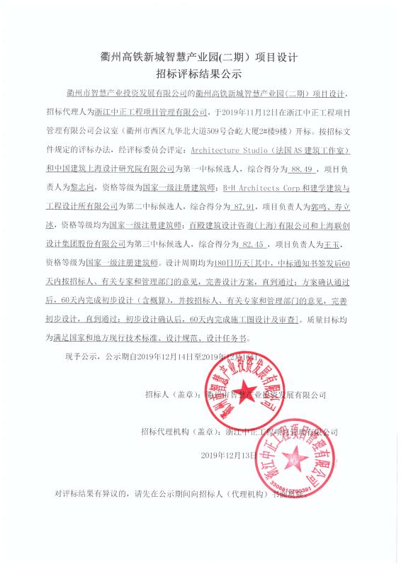 衢州市智慧產(chǎn)業(yè)投資發(fā)展有限公司的衢州高鐵新城智慧產(chǎn)業(yè)園(二期)項(xiàng)目設(shè)計(jì),招標(biāo)代理人為浙江中正工程項(xiàng)目管理有限公司,于2019年11月12日在浙江中正工程項(xiàng)目管理有限公司會議室(衢州市西區(qū)九華北大道509號合屹大廈2#樓9樓)開標(biāo)。按招標(biāo)文件規(guī)定的評標(biāo)辦法,經(jīng)評標(biāo)委員會評定:Architecture Studio(法國AS建筑工作室)和中國建筑上海設(shè)計(jì)研究院有限公司為第一中標(biāo)候選人,綜合得分為 88.49 ,項(xiàng)目負(fù)責(zé)人為黎志向,資格等級為國家一級注冊建筑師;B+H Architects Corp和建學(xué)建筑與工程設(shè)計(jì)所有限公司為第二中標(biāo)候選人,綜合得分為 87.91,項(xiàng)目負(fù)責(zé)人為郭鳴、壽立冰,資格等級均為國家一級注冊建筑師;百殿建筑設(shè)計(jì)咨詢(上海)有限公司和上海聯(lián)創(chuàng)設(shè)計(jì)集團(tuán)股份有限公司為第三中標(biāo)候選人,綜合得分為 82.45 ,項(xiàng)目負(fù)責(zé)人為王玉,資格等級為國家一級注冊建筑師。設(shè)計(jì)周期均為180日歷天[其中,中標(biāo)通知書簽發(fā)后60天內(nèi)按招標(biāo)人、有關(guān)專家和管理部門的意見,完善設(shè)計(jì)方案,直到通過;方案確認(rèn)通過后,60天內(nèi)完成初步設(shè)計(jì)(含概算),并按招標(biāo)人、有關(guān)專家和管理部門的意見,完善初步設(shè)計(jì),直到通過;初步設(shè)計(jì)確認(rèn)后,60天內(nèi)完成施工圖設(shè)計(jì)及審查]。質(zhì)量目標(biāo)均為滿足國家和地方現(xiàn)行技術(shù)標(biāo)準(zhǔn)、設(shè)計(jì)規(guī)范、設(shè)計(jì)任務(wù)書。