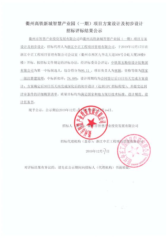 衢州市智慧產(chǎn)業(yè)投資發(fā)展有限公司的衢州高鐵新城智慧產(chǎn)業(yè)園(一期)項目方案設(shè)計及初步設(shè)計,招標代理人為浙江中正工程項目管理有限公司,于2019年12月17日在浙江中正工程項目管理有限公司會議室(衢州市西區(qū)九華北大道509號合屹大廈2#樓9樓)開標。按招標文件規(guī)定的評標辦法,經(jīng)評標委員會評定:中鐵第五勘察設(shè)計院集團有限公司為第一中標候選人,綜合得分為90.11 ,項目負責人為宋穎,資格等級為國家一級注冊建筑師;中標折扣率:78.88%;設(shè)計周期均為合同簽訂后15日歷天完成方案設(shè)計;方案確定后30日歷天內(nèi)完成深化后的初步設(shè)計(達到EPC招標程度),并提交達到評審條件的詳細概算清單。質(zhì)量目標均為滿足國家和地方現(xiàn)行技術(shù)標準、設(shè)計規(guī)范、設(shè)計任務(wù)書。