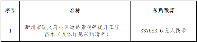 根據(jù)《衢州市市屬國有企業(yè)采購管理辦法(試行)》規(guī)定,以公開詢價(jià)方式對(duì)衢州市瑞文府小區(qū)道路景觀等提升工程——苗木進(jìn)行采購,歡迎合格的供應(yīng)商參加。