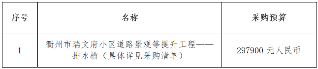 根據(jù)《衢州市市屬國有企業(yè)采購管理辦法(試行)》規(guī)定,以公開詢價(jià)方式對衢州市瑞文府小區(qū)道路景觀等提升工程——排水槽進(jìn)行采購,歡迎合格的供應(yīng)商參加。