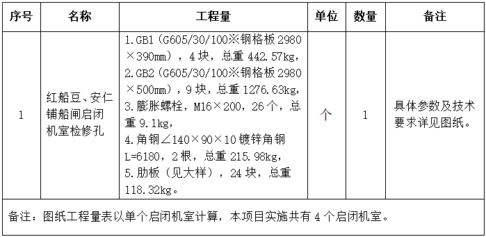 一、采購(gòu)內(nèi)容:紅船豆、安仁鋪船閘啟閉機(jī)室檢修孔鋼蓋板重新制作及安裝采購(gòu),詳見(jiàn)下表,紅船豆、安仁鋪船閘啟閉機(jī)室個(gè)數(shù)共4個(gè),采購(gòu)總預(yù)算價(jià)為人民幣111800元(單價(jià)不超過(guò)27950元/個(gè))。