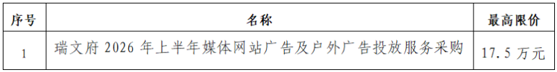 一、采購項目名稱:瑞文府2026年上半年媒體網(wǎng)站廣告及戶外廣告投放服務采購項目