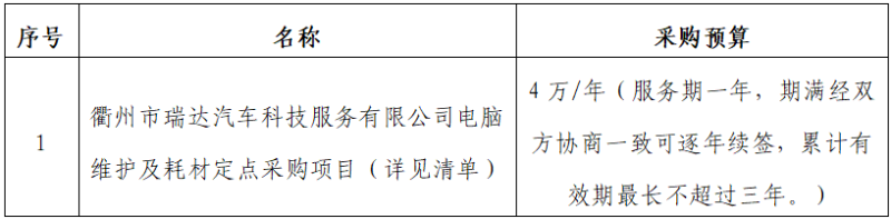 一、項(xiàng)目名稱:衢州市瑞達(dá)汽車科技服務(wù)有限公司電腦維護(hù)及耗材定點(diǎn)采購項(xiàng)目