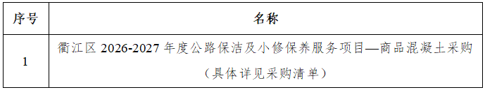一、采購項目名稱:衢江區(qū)2026-2027年度公路保潔及小修保養(yǎng)服務(wù)項目—商品混凝土采購
