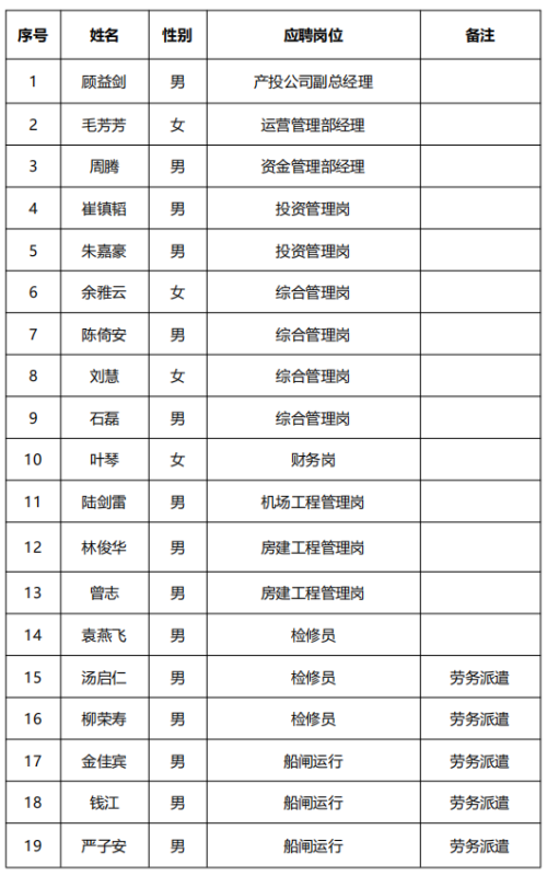 根據(jù)《衢州市交通投資集團(tuán)有限公司招聘工作人員公告》要求,現(xiàn)將擬錄用人員名單公示如下:
