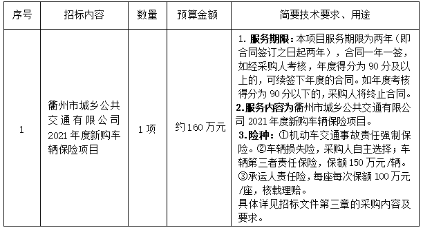二、項(xiàng)目名稱:衢州市城鄉(xiāng)公共交通有限公司2021年度新購(gòu)車輛保險(xiǎn)項(xiàng)目