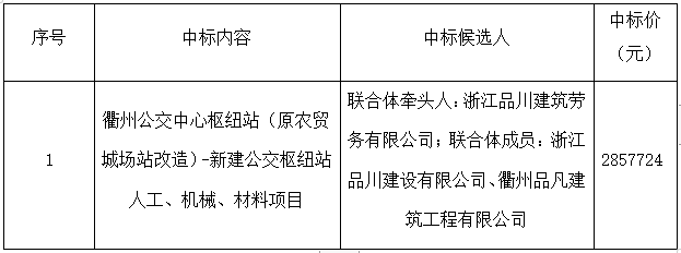 根據(jù)《中華人民共和國招標(biāo)投標(biāo)法》等有關(guān)法律法規(guī)的規(guī)定,浙江建安工程管理有限公司受浙江衢交建設(shè)工程有限公司委托,對其衢州公交中心樞紐站(原農(nóng)貿(mào)城場站改造)-新建公交樞紐站人工、機(jī)械、材料項(xiàng)目采用公開招標(biāo)方式進(jìn)行招標(biāo)。浙江建安工程管理有限公司于2021年6月17日09時(shí)30分在衢州市交通投資集團(tuán)二樓開標(biāo)廳(衢州市柯城區(qū)白云街道花園中大道86號(hào))進(jìn)行開評標(biāo)。評標(biāo)結(jié)果及相關(guān)事宜現(xiàn)公示如下: