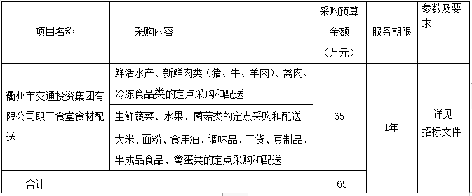 參照《中華人民共和國政府采購法》、《政府采購貨物和服務(wù)招標(biāo)投標(biāo)管理辦法》等規(guī)定,浙江中信工程咨詢有限公司受衢州市交通投資集團(tuán)有限公司委托,就衢州市交通投資集團(tuán)有限公司職工食堂食材配送采購項目進(jìn)行公開招標(biāo),歡迎國內(nèi)合格的供應(yīng)商前來投標(biāo)。