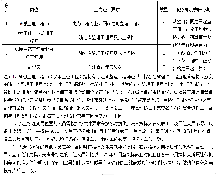 要求具備有效的國家注冊(cè)監(jiān)理工程師證書,注冊(cè)專業(yè)為電力工程。國家注冊(cè)監(jiān)理工程師:衢州市區(qū)(含市本級(jí)、柯城區(qū)、衢江區(qū)、智慧新城、智造新城,余同)外不得有在建工程的監(jiān)理業(yè)務(wù)(含已中標(biāo)工程或?yàn)榈谝恢袠?biāo)候選人的監(jiān)理業(yè)務(wù),余同),衢州市區(qū)不得有三個(gè)在建工程的監(jiān)理業(yè)務(wù);