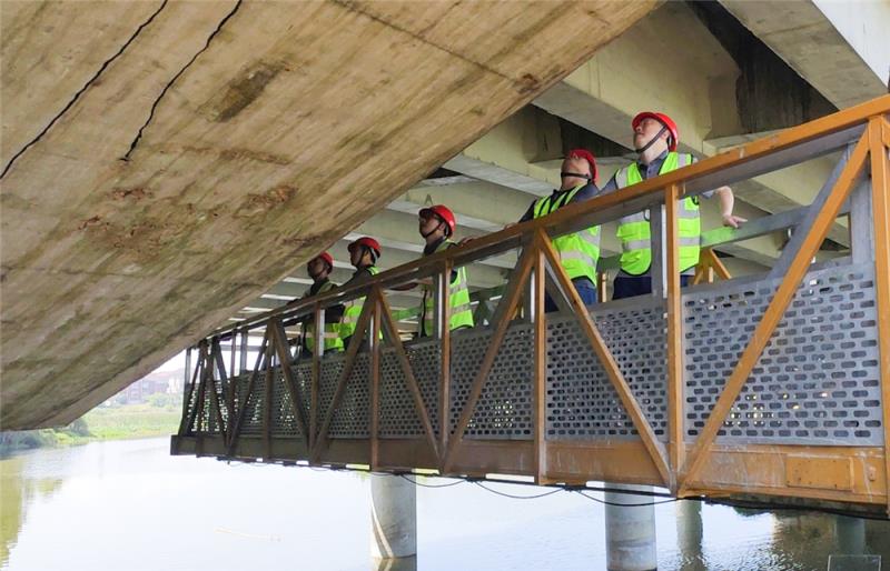 為順利完成該項目檢測工作,交科檢測公司制定了檢測技術(shù)方案,組織從事路基工程、路面工程、橋梁工程等工作的專業(yè)技術(shù)人員,前往現(xiàn)場進行勘探、資料收集、檢測方案交底、校驗檢查儀器設(shè)備,為項目檢測做好前期準備工作。同時,細化檢測人員的分工與職責,分別組成檢測組和安全保障組,參加現(xiàn)場檢測工作。并將檢測組分為實體檢測組和外觀檢查組兩個組別,下設(shè)橋梁組、路線組、交安組等進行統(tǒng)籌安排,全面、高效地開展工作。