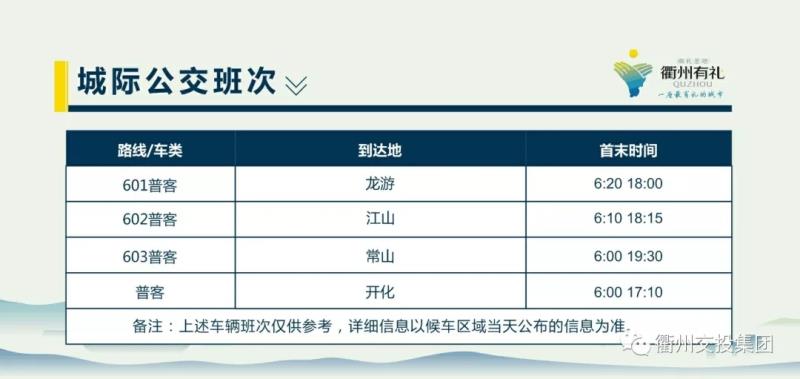 城際公交共設置班線4條,分別前往龍游、江山、常山、開化等各縣(市),平均30分鐘便有一趟發(fā)車。