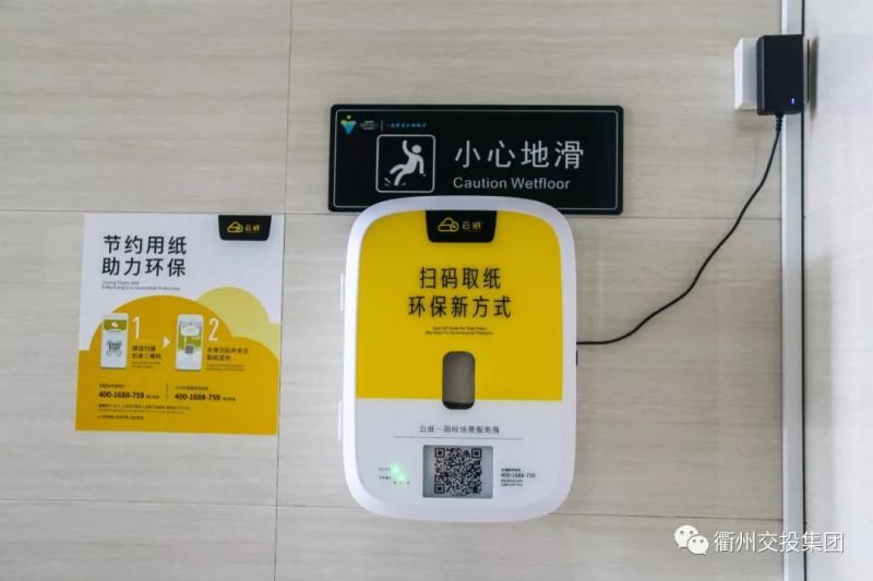 公共衛(wèi)生間內(nèi)設置了自助取紙機,只要使用手機微信掃描二維碼關(guān)注微信公眾號后,便可免費獲取紙巾。
