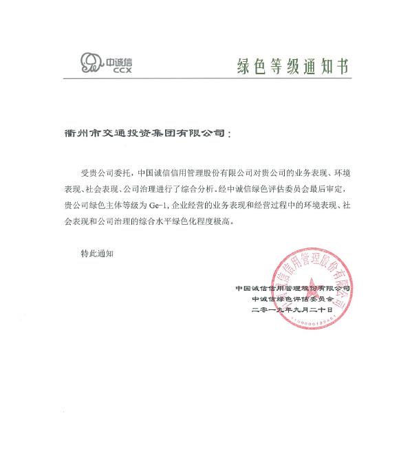 9月20日,國(guó)內(nèi)權(quán)威機(jī)構(gòu)中國(guó)誠(chéng)信信用管理股份有限公司發(fā)布,依據(jù)中國(guó)金融學(xué)會(huì)綠色金融專業(yè)委員會(huì)編制的《綠色債券支持項(xiàng)目目錄(2015年版)》、中國(guó)銀行保險(xiǎn)監(jiān)督管理委員會(huì)發(fā)布的《綠色信貸統(tǒng)計(jì)表(2013年)》、國(guó)家發(fā)展和改革委員會(huì)發(fā)布的《綠色債券發(fā)行指引》等國(guó)家及地方相關(guān)標(biāo)準(zhǔn),認(rèn)為衢州市交通投資集團(tuán)有限公司企業(yè)經(jīng)營(yíng)的業(yè)務(wù)表現(xiàn)和經(jīng)營(yíng)過程中的環(huán)境表現(xiàn)、社會(huì)表現(xiàn)和公司治理的綜合水平綠色化程度極高,授予Ge-1綠色企業(yè)等級(jí)。