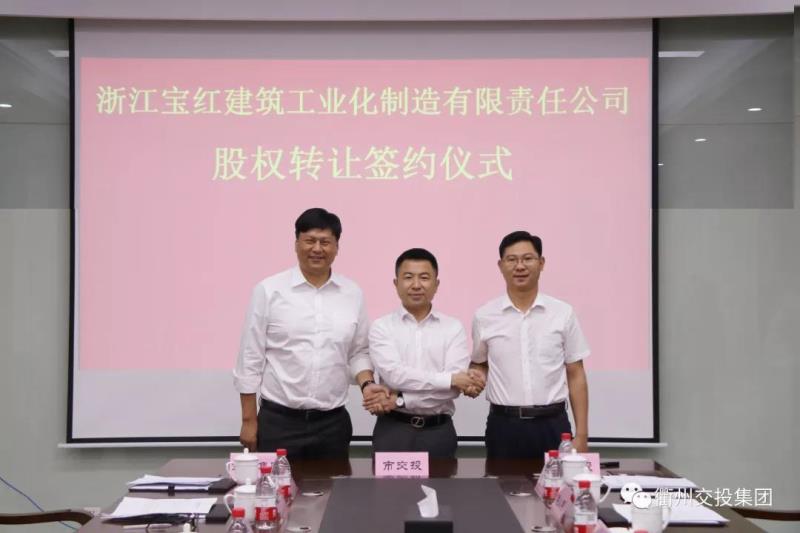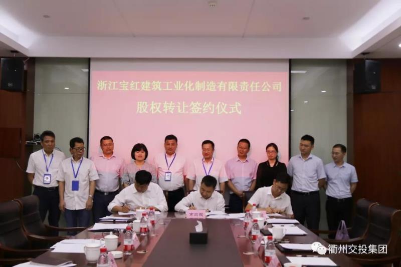 2019年6月6日11時(shí)18分,浙江寶紅建筑工業(yè)化制造有限責(zé)任公司股權(quán)轉(zhuǎn)讓簽約儀式隆重舉行。市交投集團(tuán)董事長方世忠、衢江建投總經(jīng)理黃利、寶業(yè)集團(tuán)總經(jīng)理龐巍祥、寶紅公司總經(jīng)理婁忠華等出席儀式并參加簽約。