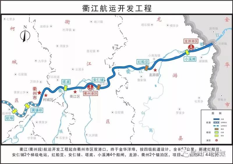 衢江(衢州段)航運開發(fā)工程是錢塘江中上游航運復興工程的重要組成部分,起自衢州市區(qū)雙港口,終至金華洋埠,按四級航道設計,全長57公里,建成后,可通航500噸級船舶,船閘單向通航能力1050萬噸/年。