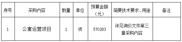 根據(jù)《衢州市國有企業(yè)采購管理辦法(試行)》規(guī)定,衢州市智信工程咨詢有限公司受衢州市瑞城科技產(chǎn)業(yè)服務(wù)有限公司的委托,就衢州高鐵新城智慧產(chǎn)業(yè)園(五期—1)A區(qū)北側(cè)(1-5層)公寓運營項目采購進(jìn)行詢價,本項目為非依法必招項目,現(xiàn)請合格供應(yīng)商參加投標(biāo)。
