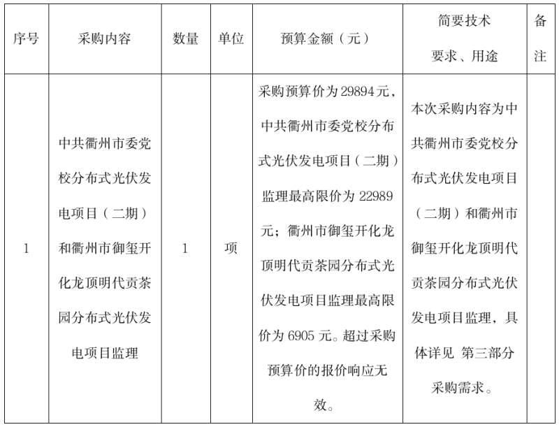 中共衢州市委黨校分布式光伏發(fā)電項目(二期)和衢州市御璽開化龍頂明代貢茶園分布式光伏發(fā)電項目監(jiān)理的詢價公告(非政府采購)