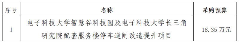 一、采購項(xiàng)目名稱:電子科技大學(xué)智慧谷科技園及電子科技大學(xué)長三角研究院配套服務(wù)樓停車道閘改造提升項(xiàng)目