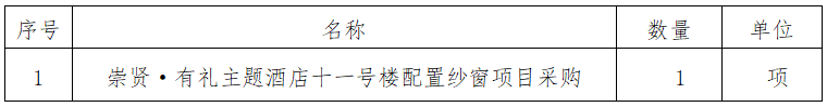 一、采購項(xiàng)目名稱:崇賢·有禮主題酒店十一號(hào)樓配置紗窗項(xiàng)目