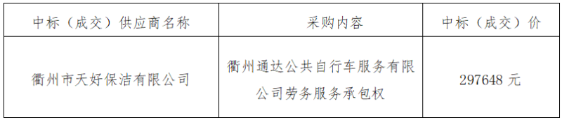 三、標(biāo)項(xiàng)名稱:衢州通達(dá)公共自行車服務(wù)有限公司勞務(wù)服務(wù)承包權(quán)項(xiàng)目