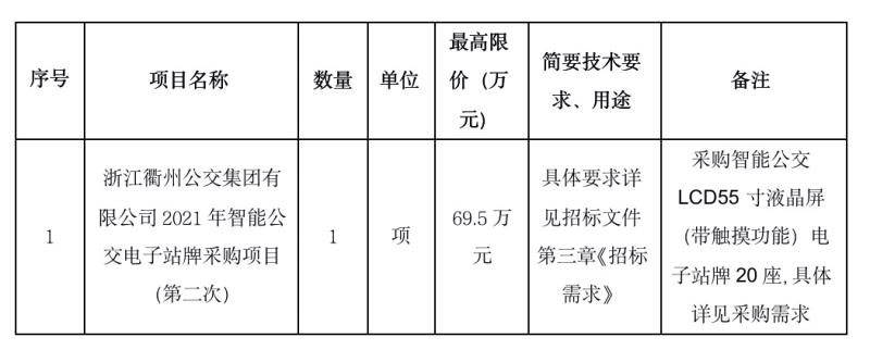 項(xiàng)目名稱:浙江衢州公交集團(tuán)有限公司2021年智能公交電子站牌采購(gòu)項(xiàng)目(第二次)