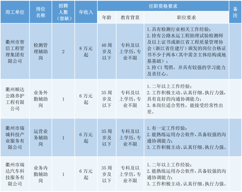 檢測(cè)管理輔助崗2人、業(yè)務(wù)外勤輔助崗1人、運(yùn)營業(yè)務(wù)輔助崗1人、業(yè)務(wù)內(nèi)勤輔助崗1人。